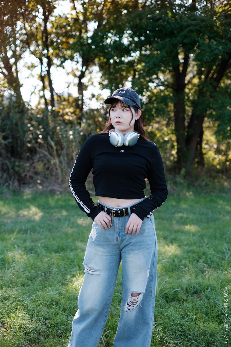 服装は、ジーンズに厚底スニーカーでラフなコーデ。